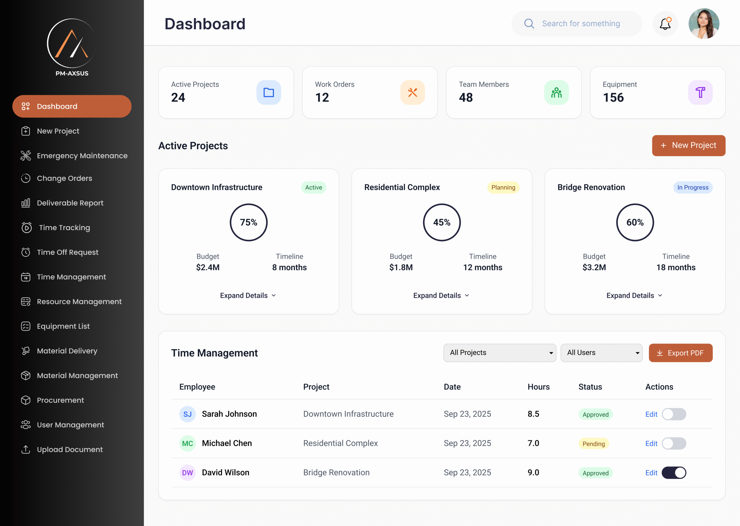 PM-Axsus is the all-in-one system built by contractors, for contractors. From time tracking and safety logs to procurement, compaction, and pressure test reports — everything is logged, branded, and ready when you need it. No more chasing papers, missed inspections, or payroll disputes.